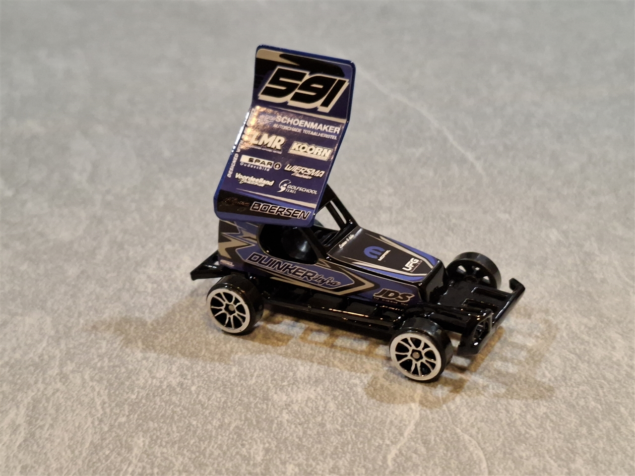 Mini model stockcar van # 591 Barry Boersen Schaal 1 : 62 made in China geproduceerd door Edcreations uit Engeland Belettering door RSD Kinderen spelen er uuren soms dagen lang mee, ook leuk om te verzamelen. niet geschikt voor kinderen onder de 3 jaar.