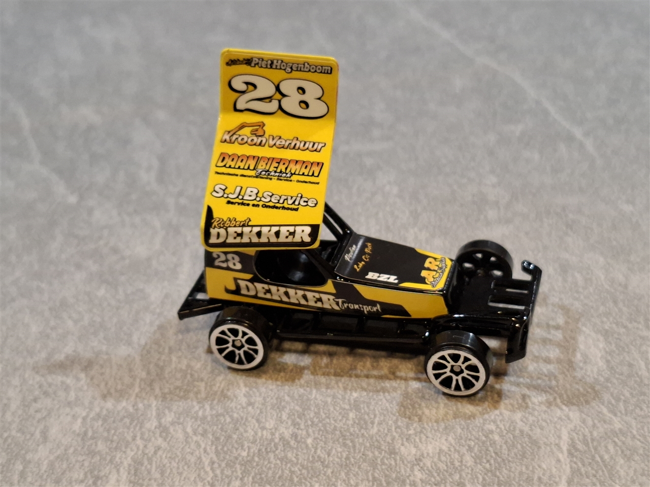 Mini model stockcar van # 28 Robert Dekker Schaal 1 : 62 made in China geproduceerd door Edcreations uit Engeland Belettering door JW signs Kinderen spelen er uuren soms dagen lang mee, ook leuk om te verzamelen. niet geschikt voor kinderen onder de 3 jaar.