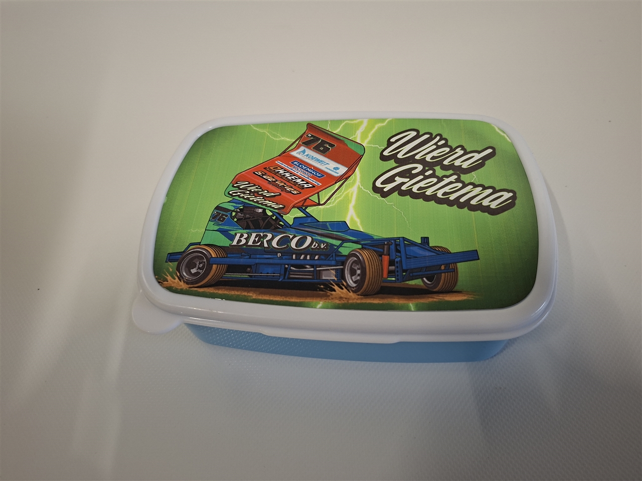 Broodtrommel van plastic metmet bedrukt aluminium plaatje op dekselDeksel met de hand afwassen voor langer plezier
