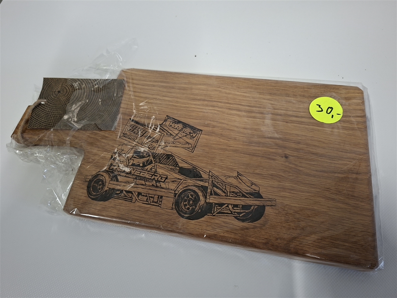 Eikenhouten geoliede borrelplank Met stockcar van Ivan Rennebergin het hout gelazerd.Dit is nog eens leuk kaas en worst op tefel zetten