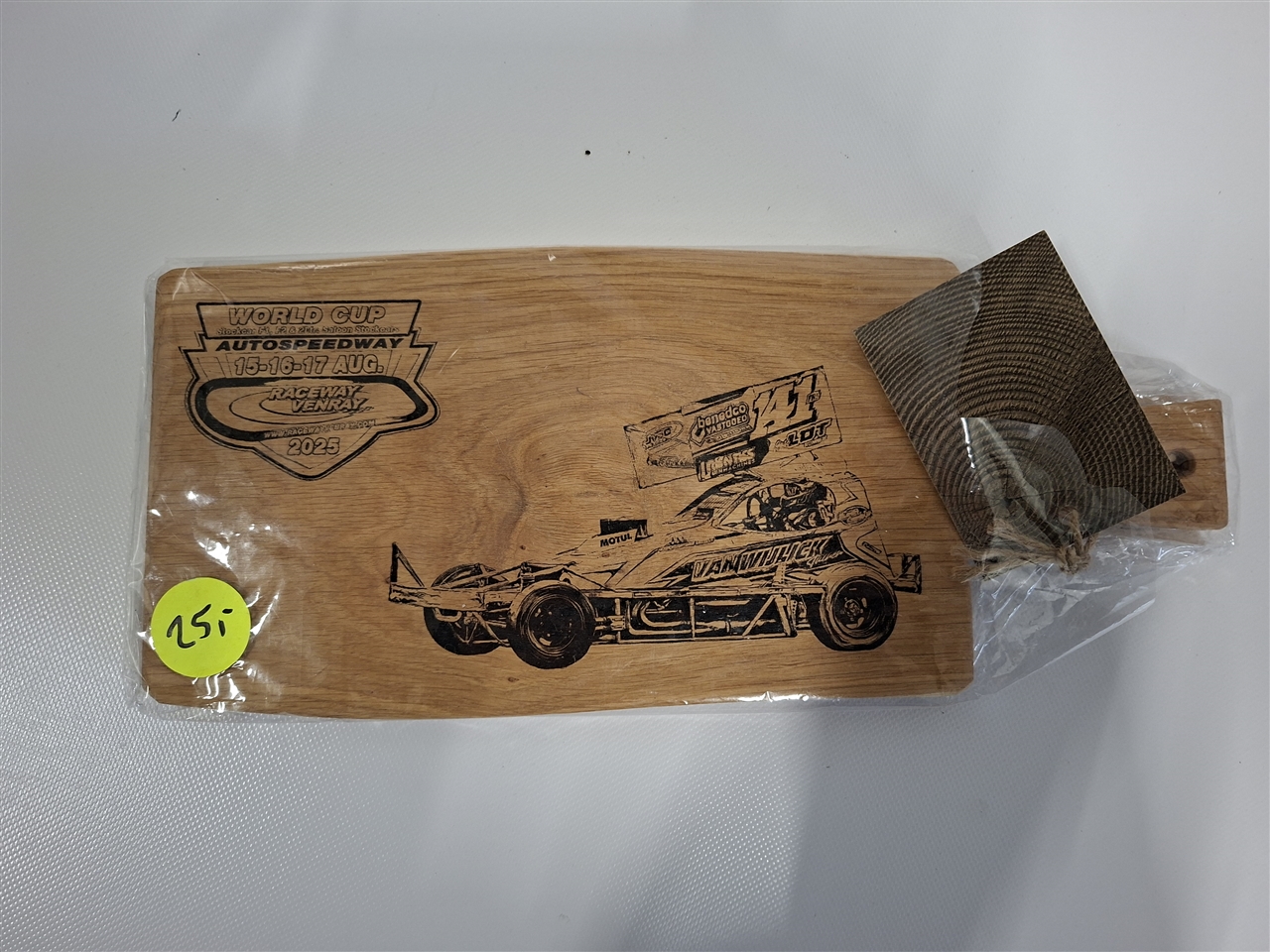 Eikenhouten geoliede borrelplank Met stockcar van team Baarlo met coureur Richard Falkena in het hout gelazerd. Dit is nog eens leuk kaas en worst op tefel zetten